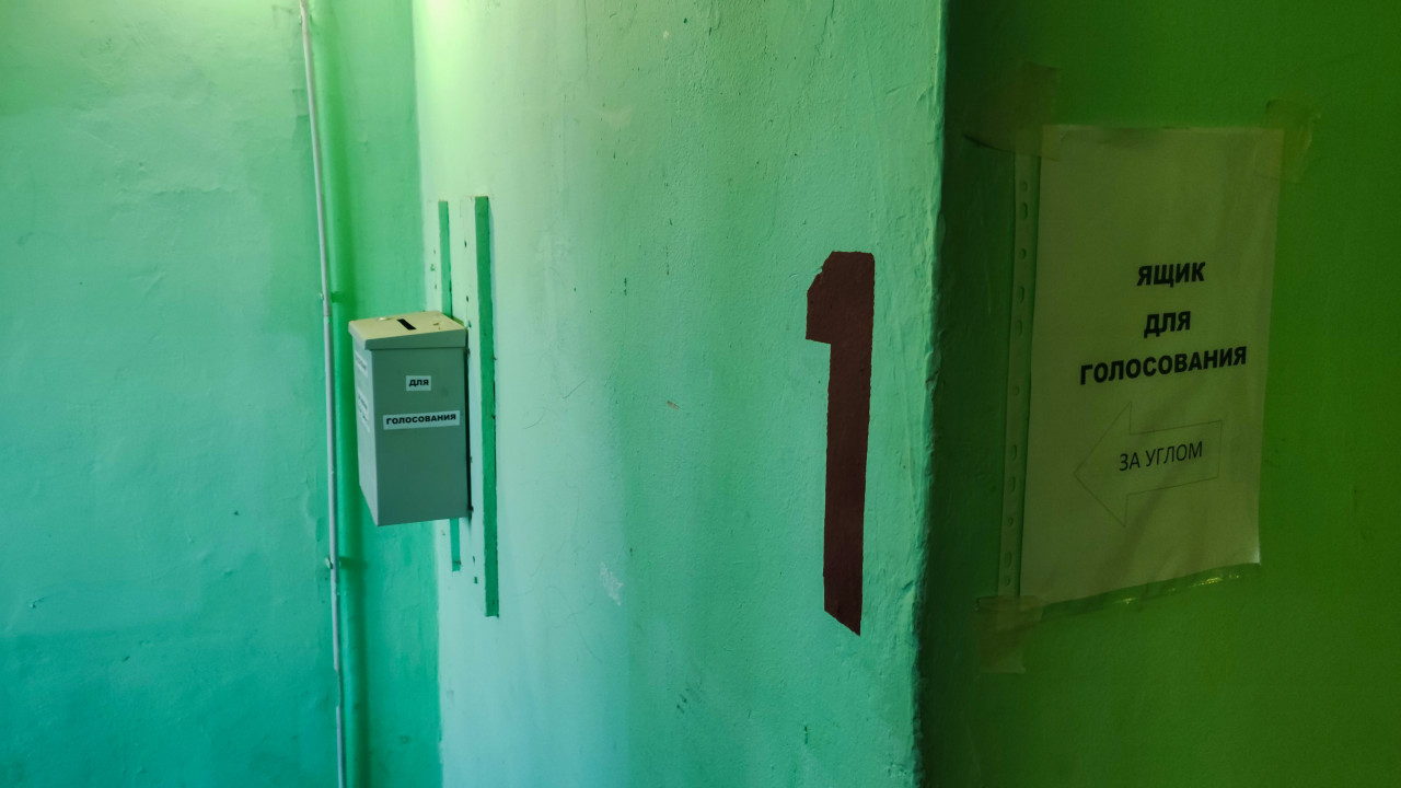 Фотография демонстрирует внутренний угол подъезда, окрашенного в зелёный цвет, с номером «1» на стене и металлическим ящиком с надписью «для голосования». Бумажный лист указывает направление к ящику за углом. Освещение лампой в верхней части создаёт характерную тень, типичную для старых домов 1970–1980-х годов. Кадр отражает реалии городской среды и административного быта. Может использоваться в статьях о выборах, городских условиях и архитектуре советского периода.