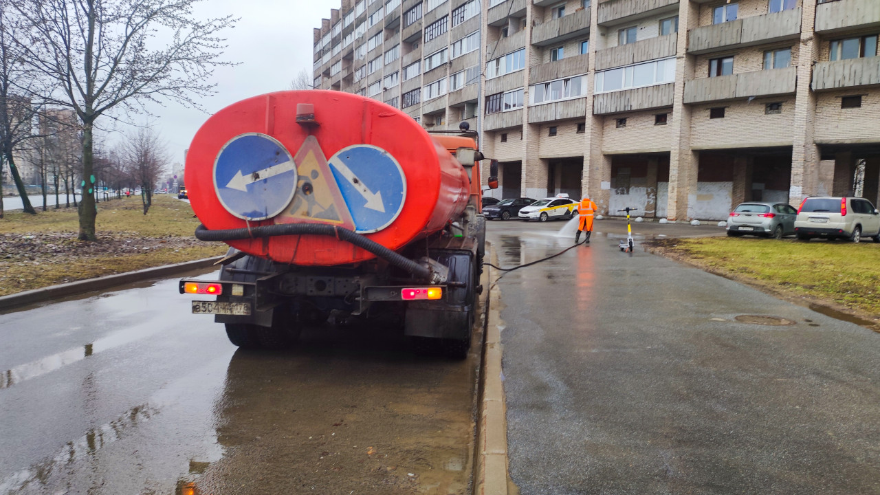 На фото изображён оранжевый коммунальный автомобиль с цистерной, стоящий у жилого дома советской постройки. Работник в яркой оранжевой форме омывает асфальт мощной струёй воды. Рядом припаркованы автомобили и электросамокат, на заднем плане — многоэтажный кирпичный дом и тротуар с деревьями без листвы. Сцена снята в пасмурный день, дорога влажная после осадков. Кадр отражает работу городских служб по уборке улиц и подходит для иллюстрации тем благоустройства, коммунального хозяйства и санитарной очистки.