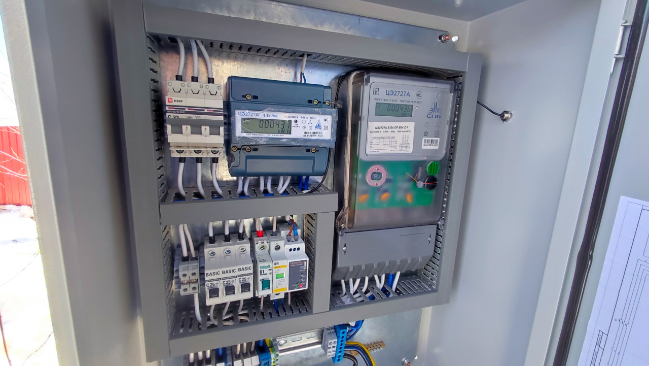 На изображении показан внутренний монтаж электрического щита с двумя установленными счетчиками, автоматическими выключателями и кабельными каналами. Видно аккуратную разводку проводов, защитные автоматы и устройство контроля параметров сети. Такое оборудование обычно располагается на вводно-распределительных узлах жилых участков. Снимок подходит для демонстрации схем подключения, примеров модернизации сетей и материалов о стандартах электромонтажа.