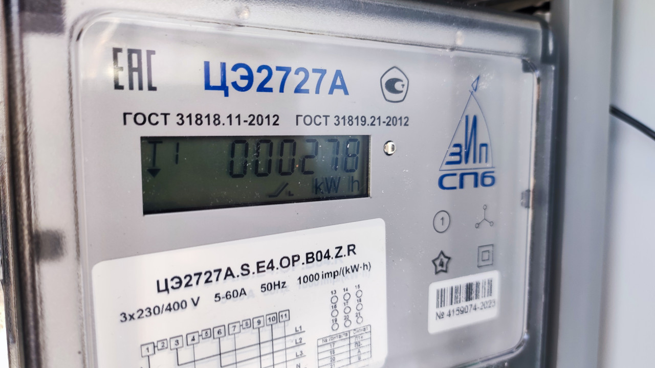 Крупный план электронного счётчика электроэнергии в уличном шкафу
