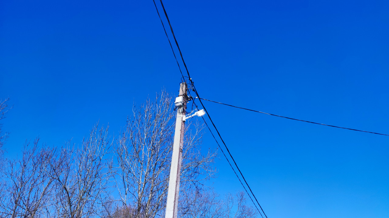 Изображение демонстрирует бетонную опору воздушных линий электропередачи с закреплённым распределительным оборудованием и узлом кабельных соединений. Фон составляют лиственные деревья без листвы, типичные для зимнего сезона. Небо чистое и безоблачное, что усиливает акцент на инженерной конструкции. Фотография не содержит архитектурных памятников или объектов культурного наследия и представляет бытовой пример сельской или пригородной инфраструктуры. Снимок можно применять в публикациях об электроэнергетике, обслуживании коммунальных сетей и инженерных коммуникациях.