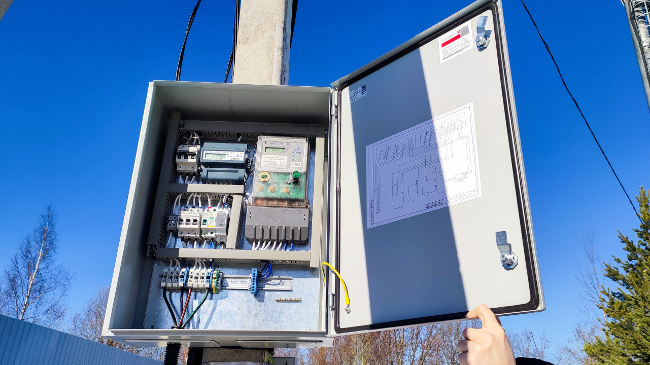 Электрощит на опоре ЛЭП с открытой распределительной панелью