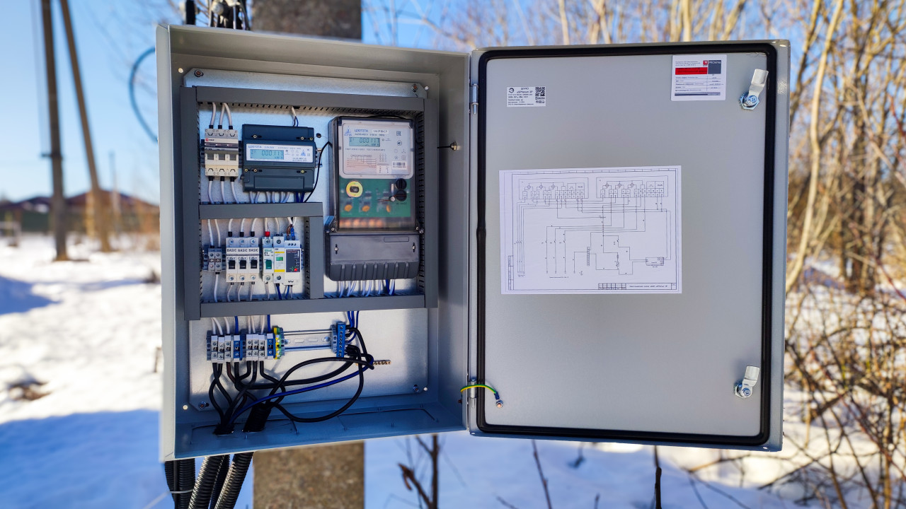 На фото показан открытый распределительный электрощит, установленный на опоре и предназначенный для учёта и распределения электроэнергии. Внутри видны автоматы, счётчики, клеммные блоки и разводка кабелей, а на внутренней части двери закреплена печатная схема подключения. На заднем плане — зимний пейзаж и кустарники, что указывает на эксплуатацию в пригородной зоне. Кадр может использоваться в образовательных и технических материалах по электромонтажу и эксплуатации распределительных устройств.