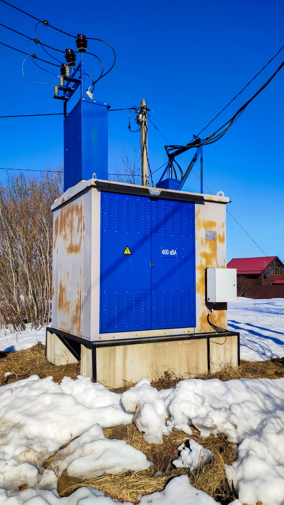 На изображении запечатлена уличная трансформаторная подстанция мощностью 400 кВА, установленная на бетонном основании в пригородной зоне. Корпус подстанции окрашен в синий и серый цвета, на крышке смонтированы изоляторы и кабельные вводы воздушной линии электропередачи. Рядом проходит уличная линия связи и электроснабжения. Снег на земле и кустарниковая растительность подтверждают зимний период эксплуатации. Фотография подходит для технических публикаций об энергоснабжении населённых пунктов и элементной базе распределительных сетей.