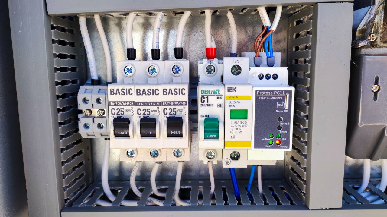 На фотографии показан внутренний фрагмент распределительного щита с модульными автоматическими выключателями серии BASIC на номинал 25 А, однополюсным автоматом DEKraft и устройством ОСП1-D производителя IEK. Справа установлен модуль Protoss-PG11 с индикаторами состояния и разъёмом Nano SIM, предназначенный для передачи данных по GPRS-сети. Кабельные линии выведены через нижние каналы, подключение выполнено на DIN-рейку. Снимок сделан в зимний период по внешнему освещению и отражению снега на корпусах. Изображение подходит для иллюстрации тем электромонтажа, систем удалённого мониторинга и промышленной автоматизации.