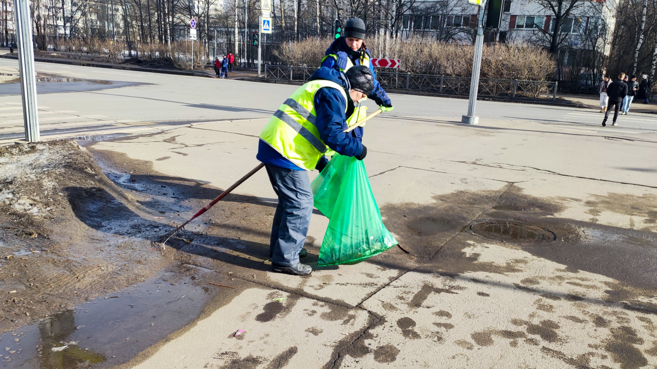 На фото два сотрудника коммунальных служб в сигнальных жилетах собирают мусор в зелёный мешок на обочине дороги. Один держит мешок, другой использует грабли для сбора мусора. На заднем плане видна городская улица с пешеходами и зданиями советской застройки. Сцена снята в весенний период, когда тает снег. Изображение подходит для использования в материалах о благоустройстве, экологии и городском обслуживании.