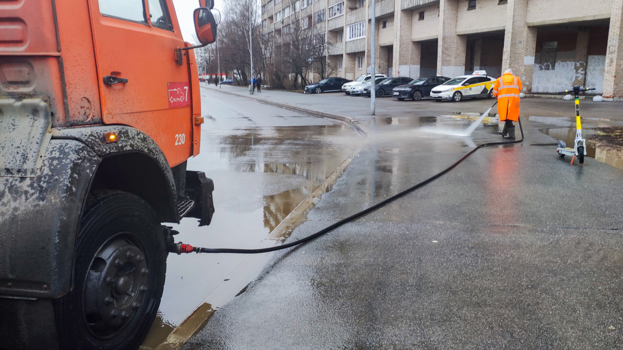 коммунальные службы уборка рабочие спецодежда рабочий мойка улиц вода шланг цистерна техника благоустройство город асфальт лужи зима весна Россия тротуар дом автомобили архитектура ЖК экология чистота безопасность санитария общественные работы инфраструктура урбанизмПохожие фотографии