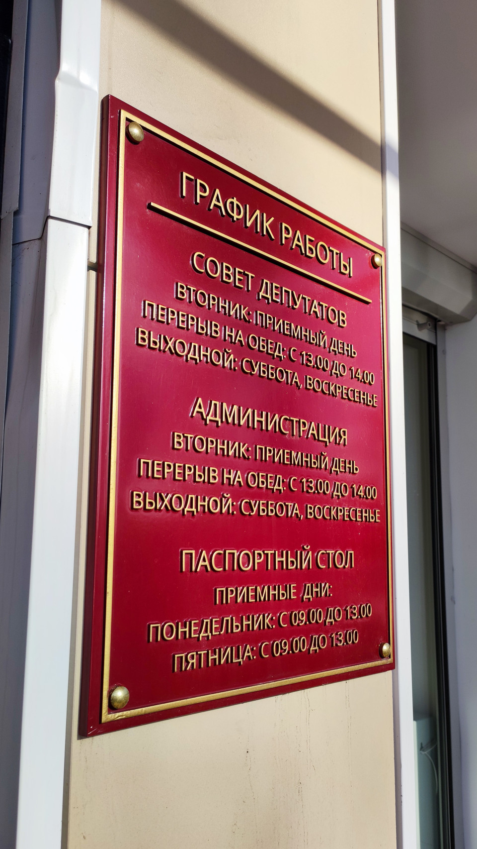 табличка фасад здание вывеска информирование официальный стиль входная группа расписание администрация паспортный стол совет депутатов госуслуги прием граждан вход официальное оформление муниципалитет архитектура регламент визуальная коммуникация дверь общественный объект населенный пункт наружное размещение официальная информация служебная зона городской контекст местное управление бюрократические процедурыПохожие фотографии