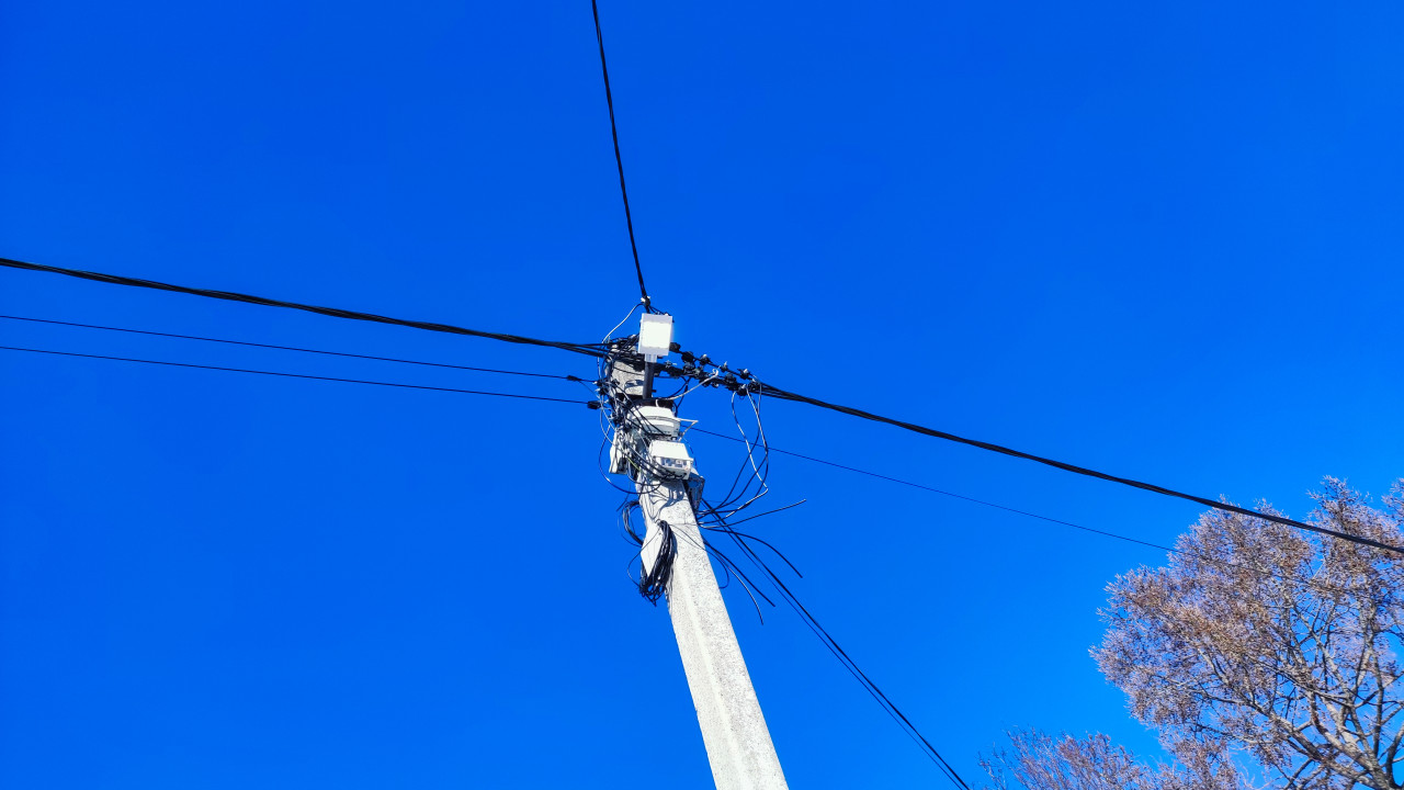 На изображении показана верхняя часть бетонной опоры воздушной линии связи и электроснабжения, на которой закреплены распределительные коробки и провода. В кадре заметны пересекающиеся кабельные трассы и небольшие монтажные элементы. Фон представляет собой чистое небо без облаков, что акцентирует внимание на конструкции. Такой снимок может использоваться в технических публикациях о сетевой инфраструктуре и монтаже линий электропередачи.