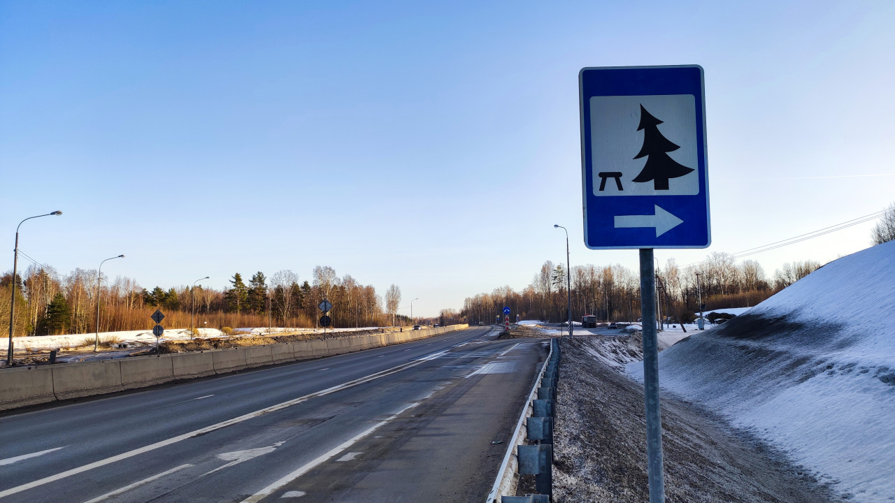 На снимке показан дорожный знак синего цвета с изображением ели и стола, указывающий направо на зону отдыха. Знак установлен на обочине многополосной трассы, окружённой заснеженным ландшафтом и редким лесом. На дороге видны элементы разметки и ограждения, а также уличные фонари. Снимок сделан при ясной погоде, предположительно в северо-западном регионе России. Изображение можно использовать в публикациях о дорожной инфраструктуре, зимних путешествиях и правилах дорожного движения.