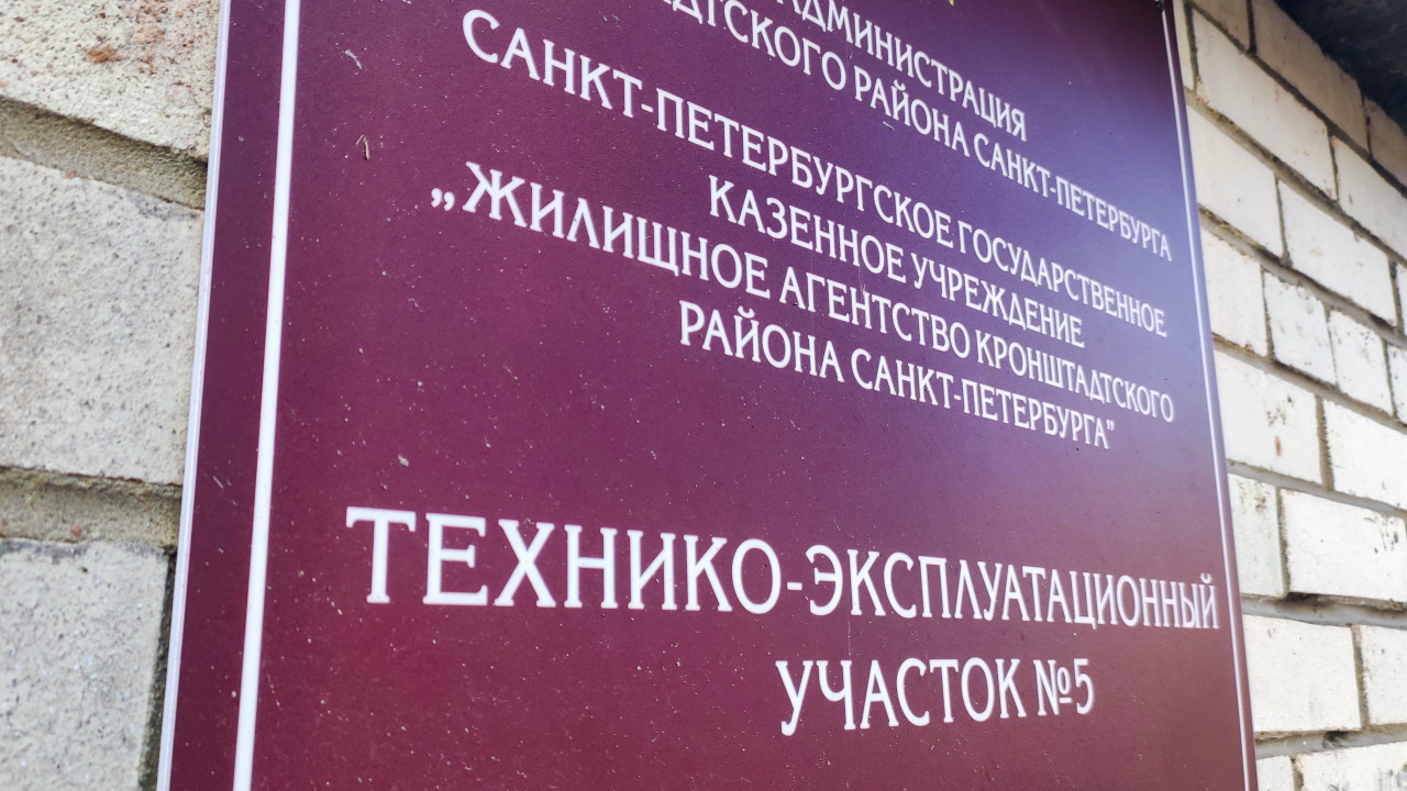 На снимке крупным планом изображён участок таблички бордового цвета с текстом о принадлежности объекта жилищному агентству Кронштадтского района Санкт-Петербурга. Табличка закреплена на светло-кирпичной стене, надписи выполнены белыми буквами. Видны текстовые элементы, указывающие на технико-эксплуатационный участок №5. Фото может использоваться для материалов о муниципальных службах, визуальной идентичности госучреждений и городской инфраструктуре.