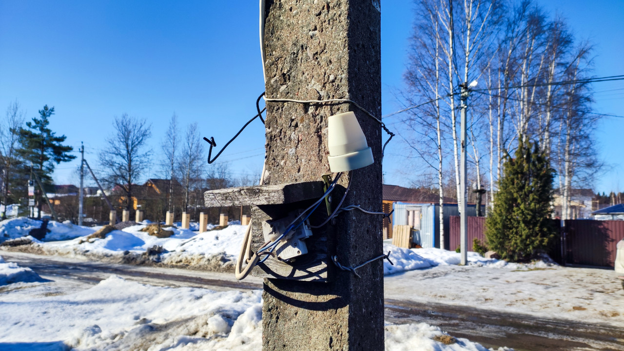 На фото показан фрагмент бетонной опоры электросети на уровне человеческого роста: видны крепления, элементы проводки и небольшой короб распределения, закреплённый на деревянной подставке. На заднем плане — загородная улица с остатками снега, берёзами и частной застройкой, что указывает на позднюю зиму или раннюю весну. Технические детали демонстрируют локальный участок распределительной сети, применяемый для подвода электричества к домам. Изображение можно использовать в материалах о подключении коммуникаций и эксплуатации инженерных линий.