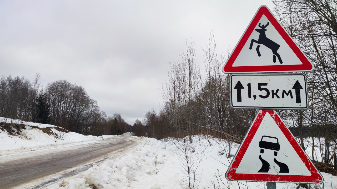 Дорожные знаки «Дикие животные» и «Скользкая дорога» зимой