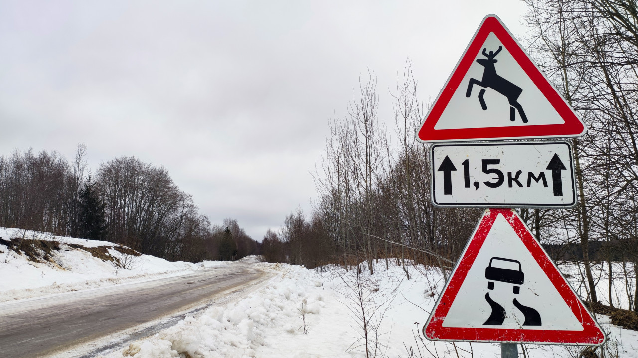 Изображение демонстрирует дорогу в зимнем пейзаже, окружённую лиственными деревьями без листвы. На переднем плане — знаки предупреждения о возможных диких животных и о скользком покрытии, с дополнительной табличкой «1,5 км». Поверхность дороги частично очищена от снега, но остаётся скользкой. Фотография передаёт атмосферу загородной местности России в зимний период и может использоваться для иллюстраций по темам транспортной инфраструктуры, климата и безопасности.