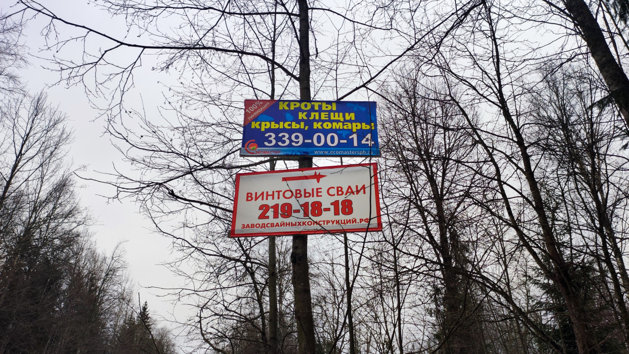 На снимке изображены два рекламных плаката, закреплённых на дереве вдоль заснежённой дороги, проходящей через лес. Верхний плакат посвящён борьбе с грызунами и насекомыми, нижний рекламирует винтовые сваи. Зимний пейзаж и отсутствие городских построек указывают на сельскую местность. Подобные элементы характерны для российских регионов, где реклама адаптируется к природной среде. Снимок можно использовать для иллюстрации уличной рекламы и социального быта.