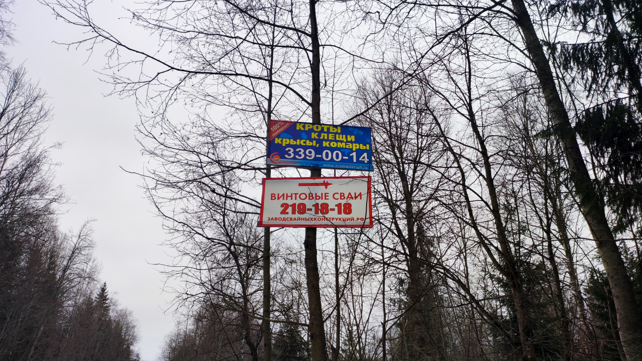 На фото изображены два рекламных плаката, прикреплённых к дереву вдоль загородной дороги. Верхний плакат посвящён борьбе с вредителями, нижний — продаже винтовых свай. На заднем плане виден заснежённый лес и дорога, уходящая в перспективу. Подобные уличные объявления типичны для российских сельских трасс, где информационные щиты часто размещаются без специальных конструкций. Фотография подходит для публикаций о визуальной культуре и неформальной рекламе.