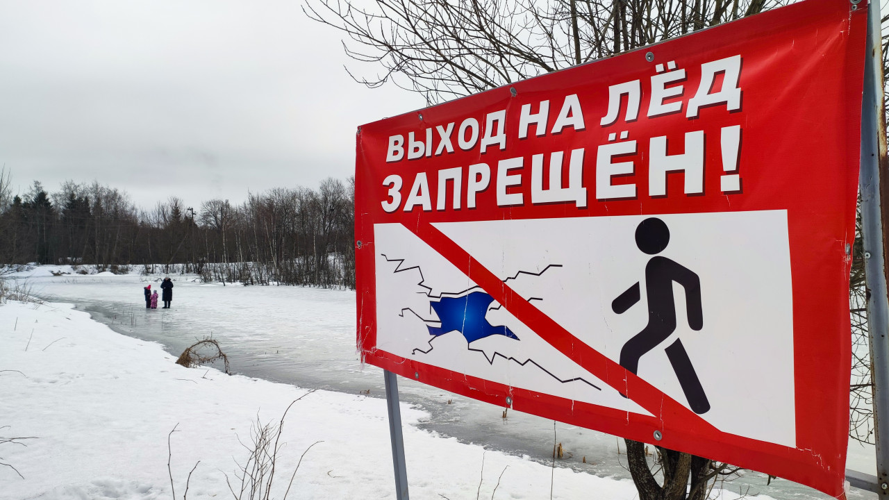 Фотография показывает крупным планом знак с предупреждением о запрете выхода на лёд, установленный на берегу замерзшего пруда. На дальнем плане видны трое людей, находящихся на льду, несмотря на запрет. Вокруг лежит снег, видны кустарники и деревья без листвы. Сцена демонстрирует типичную зимнюю ситуацию в российских городах и подходит для использования в темах, связанных с безопасностью, природой и социальной ответственностью.