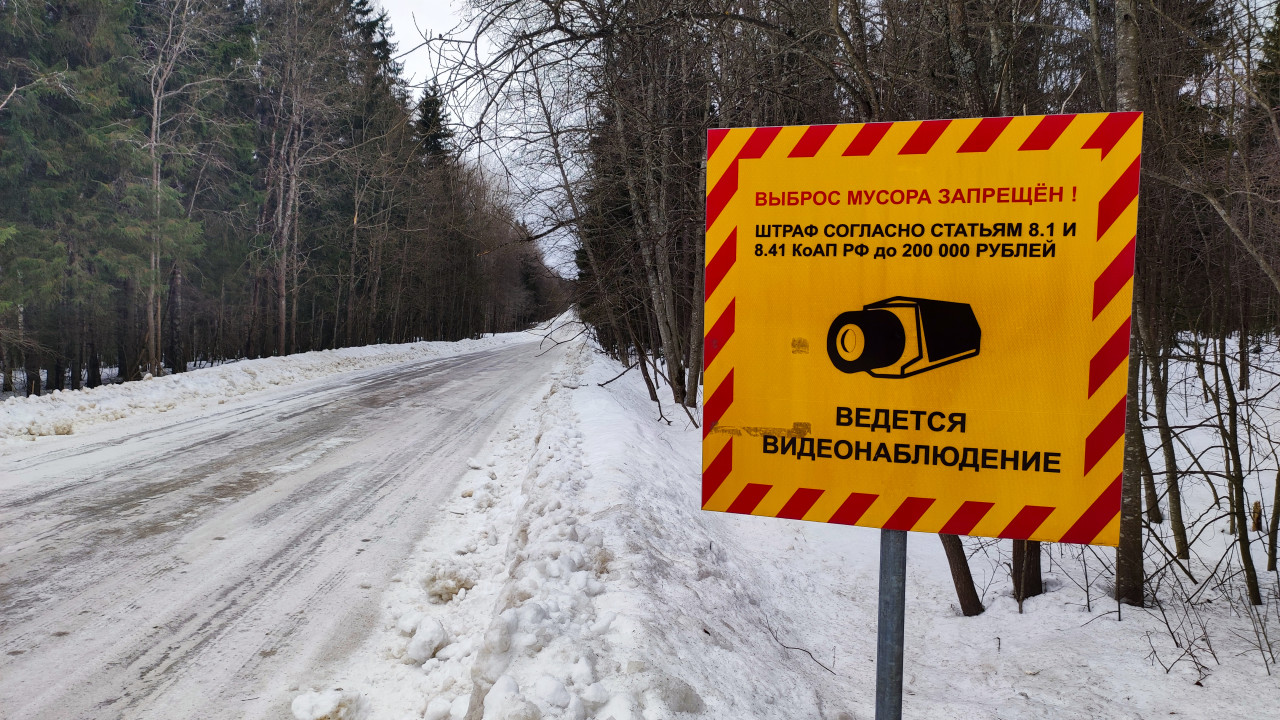 Дорожный знак о запрете выброса мусора и видеонаблюдении в зимнем лесу