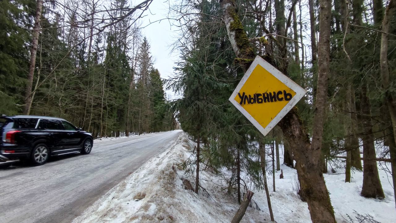 На фотографии изображён участок заснеженной дороги, по которой движется тёмный автомобиль. Справа на дереве висит жёлтый самодельный знак с надписью «Улыбнись». На заднем плане видны хвойные деревья и обочина, покрытая снегом и наледью. Фото передаёт атмосферу зимнего пути через лесистую местность в России. Снимок можно использовать в темах путешествий, дорожной безопасности, природы и позитивных визуальных сообщений.