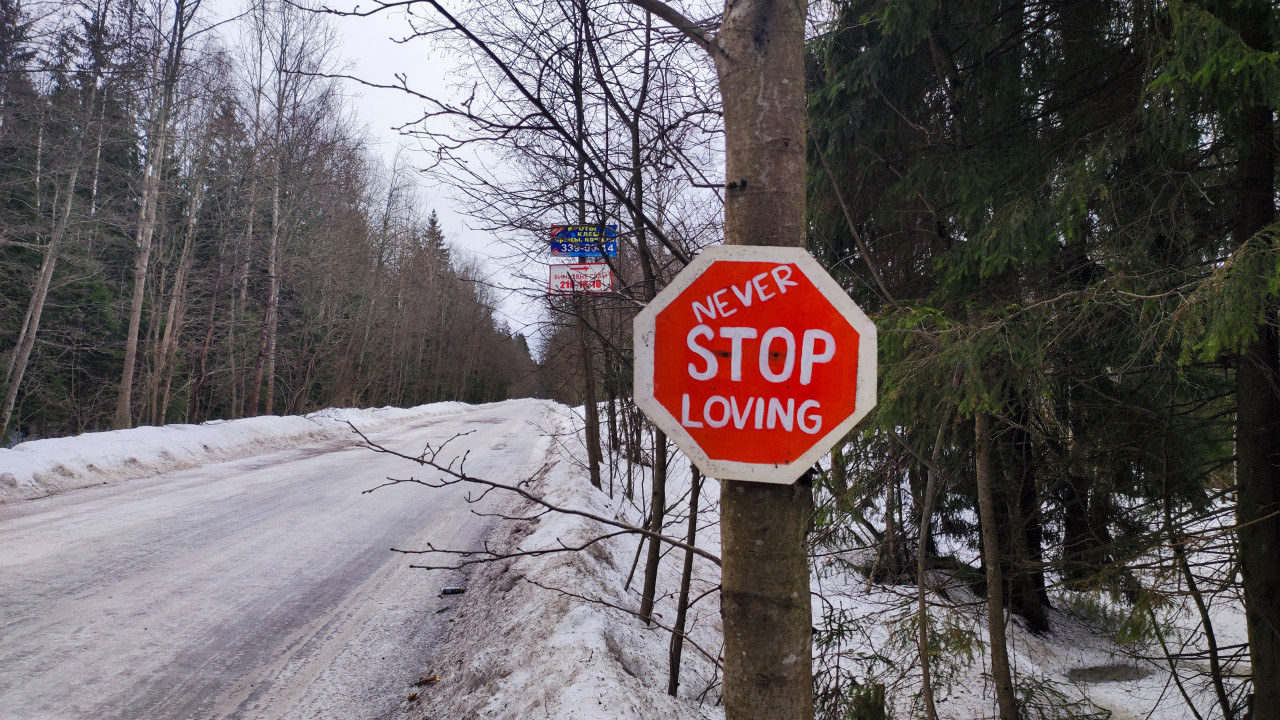На снимке изображён крупный план знака с надписью «Never Stop Loving», прикреплённого к дереву у обочины. Знак выполнен в форме дорожного «Stop» и окрашен в красный цвет с белой окантовкой. На заднем плане видна дорога, покрытая снегом, и хвойный лес. Сцена снята зимой в пригородной или сельской местности России. Изображение подходит для публикаций о любви, мотивации, уличном искусстве и природных маршрутах.
