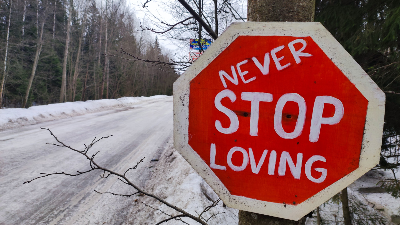 На снимке крупным планом изображён восьмиугольный знак ярко-красного цвета с надписью «Never Stop Loving». Он закреплён на дереве у заснеженной дороги, ведущей сквозь лес. На заднем плане виднеются сугробы и голые ветви деревьев. Такой знак не имеет официального значения и представляет собой художественный объект, выражающий позитивное мироощущение. Подобные работы встречаются как примеры арт-интервенций в природной среде. Фото подходит для тем об искусстве, философии и мотивации.