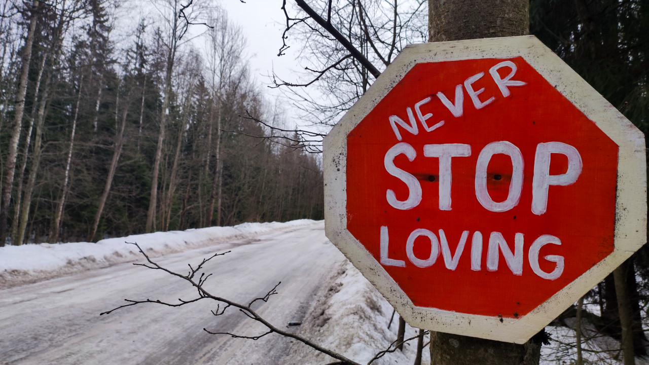 На снимке изображён уличный арт-объект в виде восьмиугольного красного знака с надписью «Never Stop Loving». Он прибит к дереву вдоль заснежённой дороги, уходящей вдаль через лес. Сцена снята при дневном свете в зимнее время. Подобные надписи часто используются как элементы уличной философии, объединяющие искусство и простые человеческие ценности. Фото подходит для иллюстрации тем вдохновения, доброты и эстетики заброшенных мест.