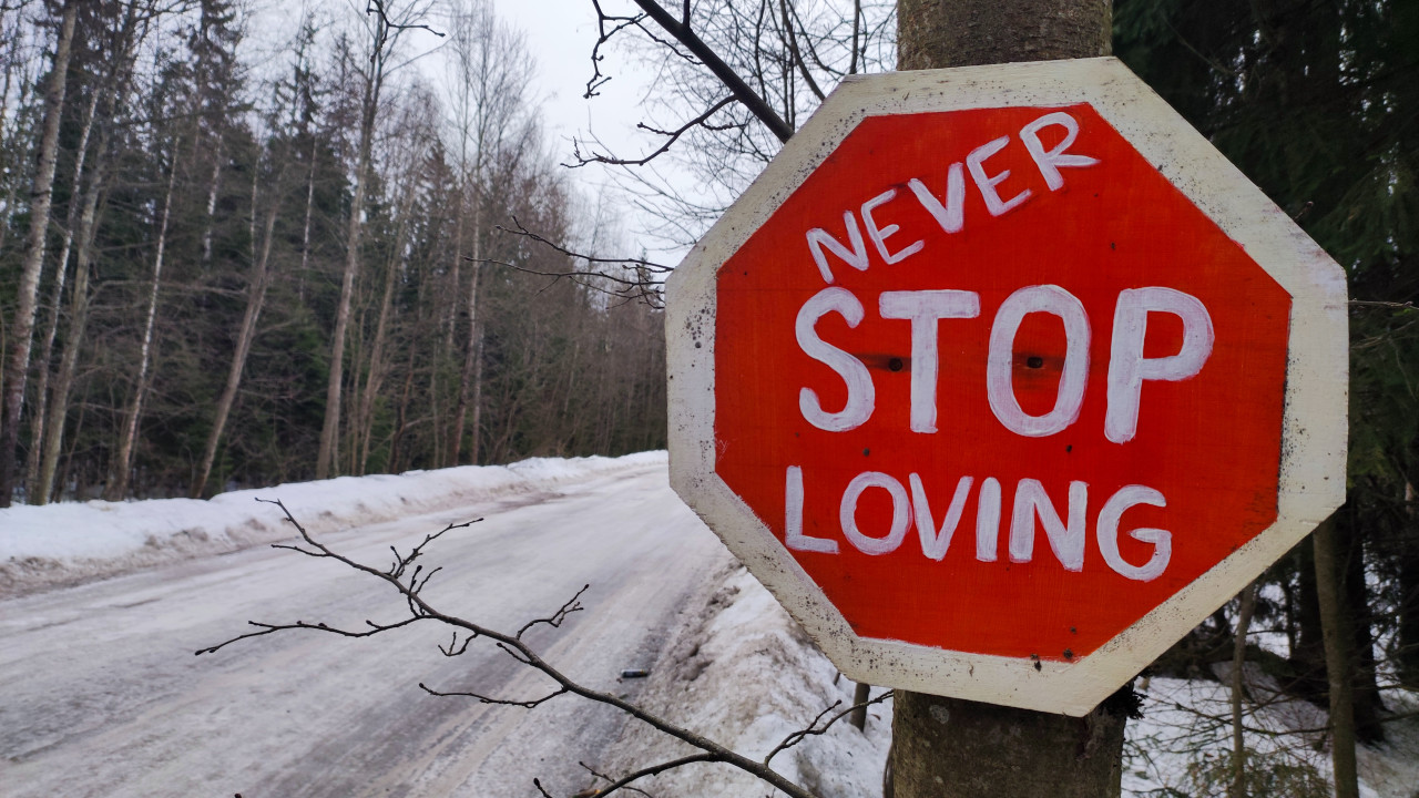 На фотографии изображён самодельный знак в форме классического дорожного «STOP», перекрашенный и дополненный надписью «Never Stop Loving». Он установлен на дереве у обочины заснежённой дороги, проходящей через лес. Сцена передаёт атмосферу уединённого зимнего пейзажа и творческого самовыражения. Подобные арт-объекты часто становятся частью локального фольклора и визуальных проектов. Снимок можно использовать в статьях о уличном искусстве и социальных месседжах.