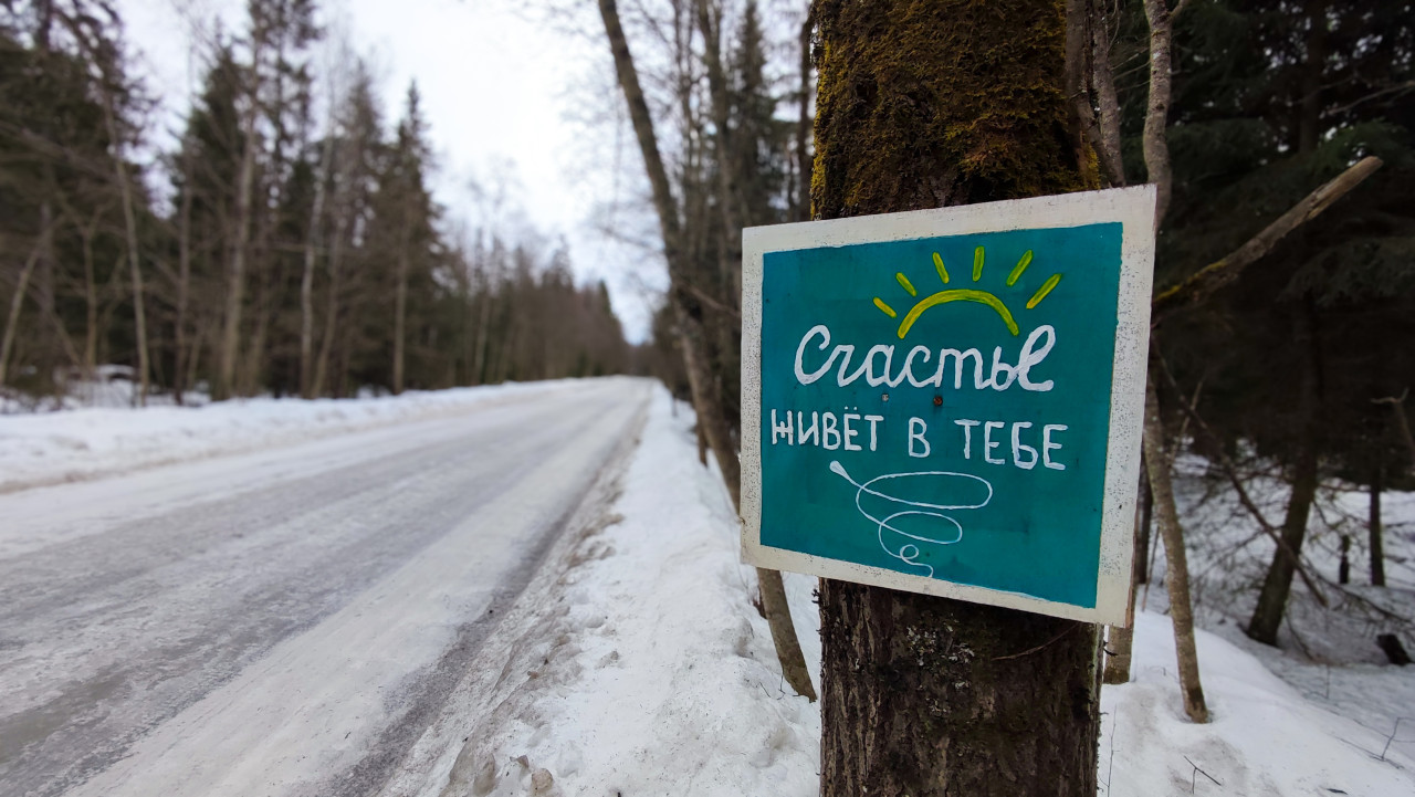 Табличка с надписью «Счастье живёт в тебе» на заснеженной лесной дороге