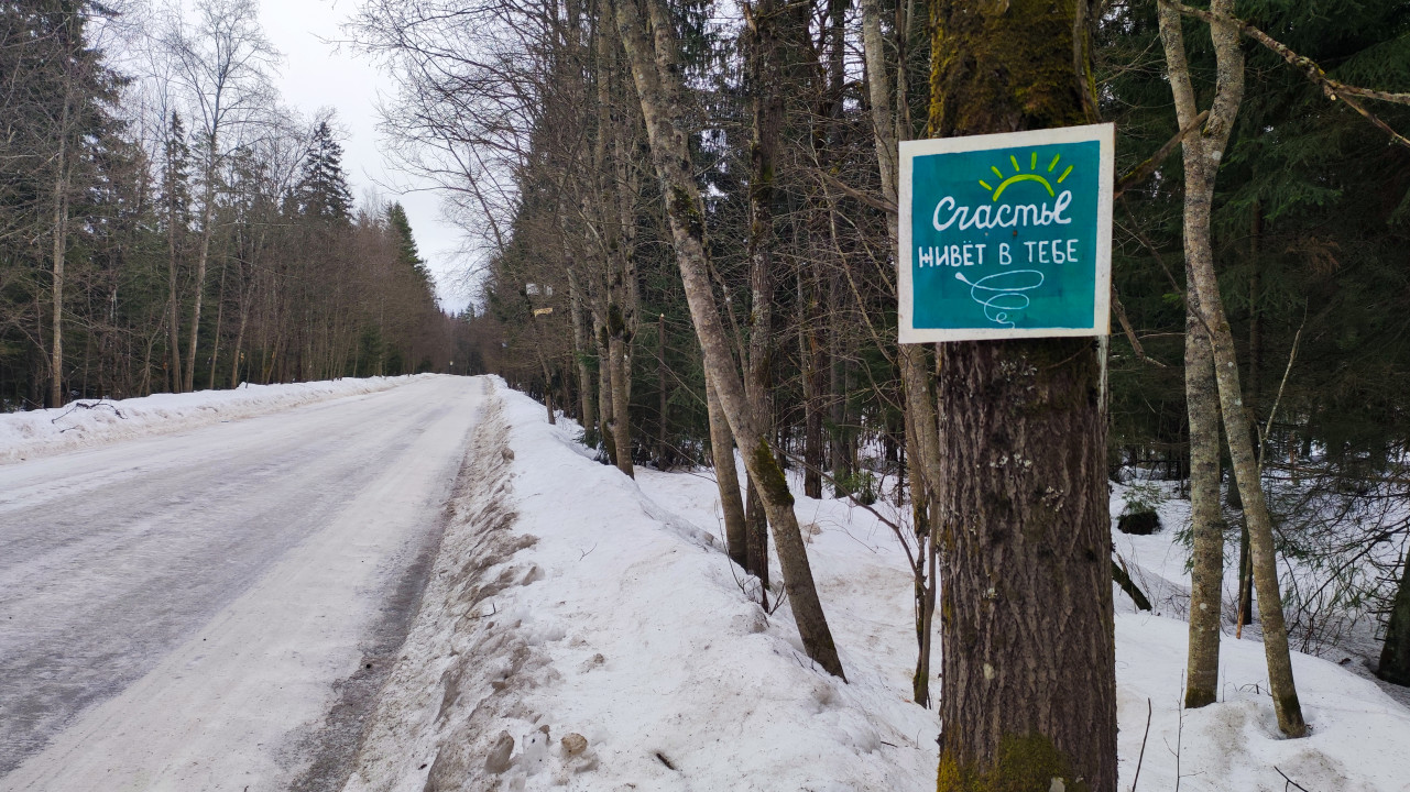 На снимке изображён самодельный квадратный знак с зелёным фоном и надписью «Счастье живёт в тебе». Он прибит к дереву у дороги, покрытой снегом. На знаке нарисовано солнце, символизирующее оптимизм. Окружающий лес создаёт контраст между суровой зимой и тёплым посланием. Такой объект можно отнести к неофициальному уличному искусству, распространённому в регионах России. Фото подойдёт для иллюстраций на темы вдохновения и психологического равновесия.