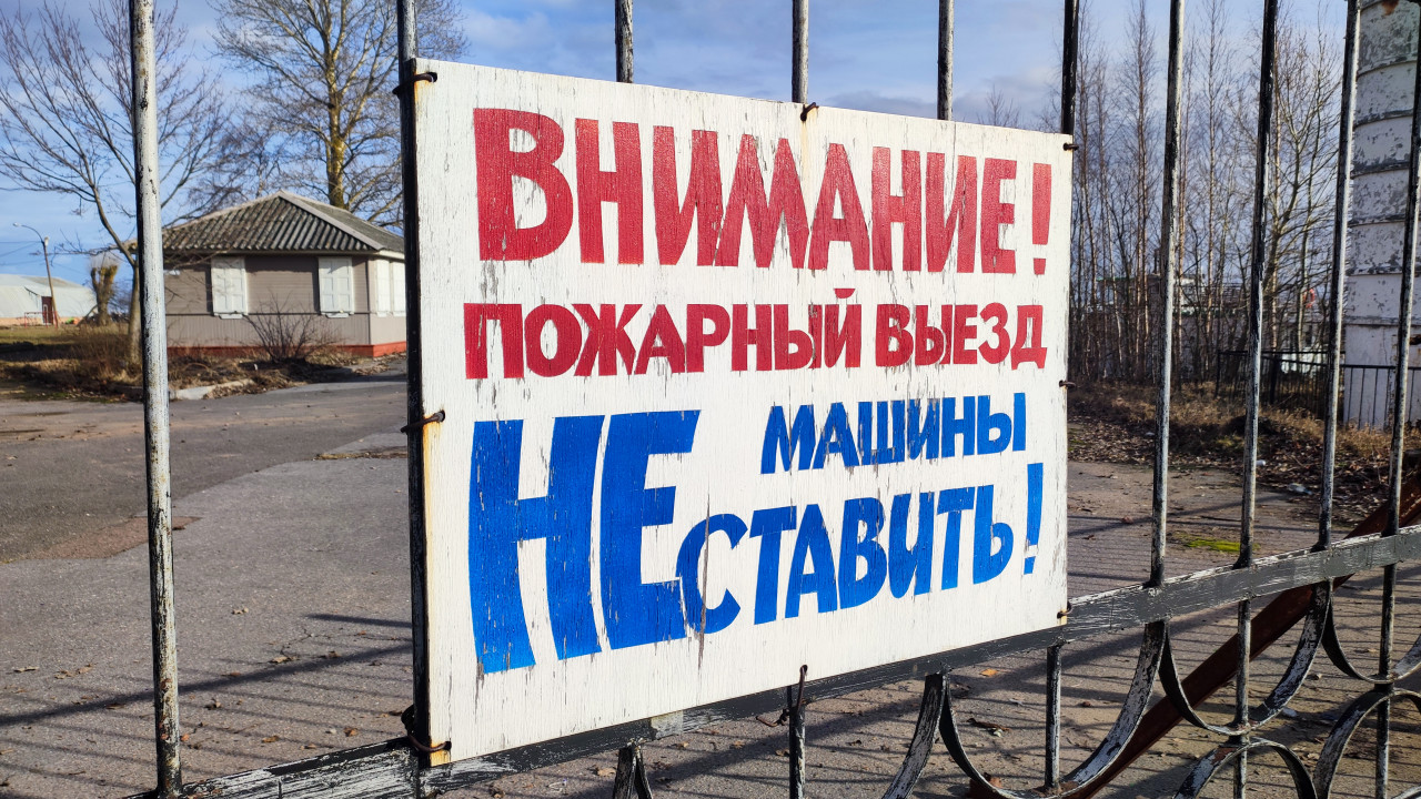 На фото крупным планом изображена табличка с текстом «Внимание! Пожарный выезд. Машины не ставить!», закрепленная на старом металлическом заборе. В кадре также виден участок асфальта и деревья на заднем плане. Вывеска выполнена в типичном стиле советских предупредительных знаков — с контрастными цветами и крупным шрифтом. Сцена снята в промышленном районе и может использоваться для тем по визуальной культуре, безопасности и городской инфраструктуре.