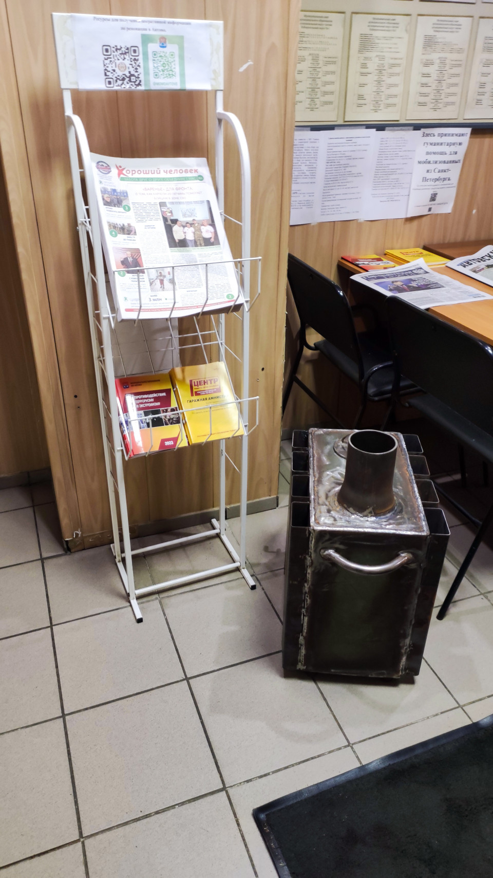 На снимке изображена стойка с брошюрами и газетами, установленная в помещении с отделкой под дерево, рядом с формой напоминающей металлическую переносную емкость или короб для хозяйственных нужд. Видны печатные материалы с тематикой местного самоуправления и общественных инициатив, а также информационный плакат с QR-кодом в верхней части стойки. Справа в кадре располагаются стол и стулья, что указывает на зону приема или ожидания посетителей. Фотография подходит для иллюстрации инфраструктуры обслуживания граждан и внутриофисной коммуникации.