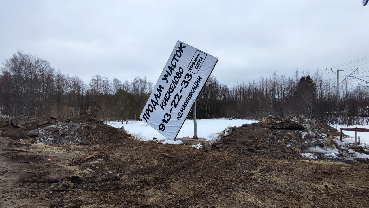 На фотографии изображён крупный рекламный щит с надписью «Продам участок. Кискелово. Коммуникации», наклонённый из-за повреждения конструкции. На переднем плане — земля и снег, на заднем — лесная полоса и опоры электропередач. Сцена отражает реальное состояние объектов наружной рекламы на региональных трассах России. Снимок можно использовать в материалах о дорожной безопасности, погодных воздействиях и инфраструктуре.