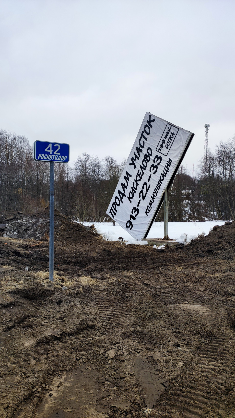 На снимке изображён синий дорожный знак «Росавтодор 42» и наклонённый рекламный щит с текстом о продаже земельного участка. Конструкция щита выглядит повреждённой, опора наклонена. Вокруг — земля, снег и деревья без листвы. На горизонте видна вышка сотовой связи. Фото иллюстрирует состояние дорожной и рекламной инфраструктуры зимой и может использоваться для тематических публикаций о благоустройстве и региональных дорогах.