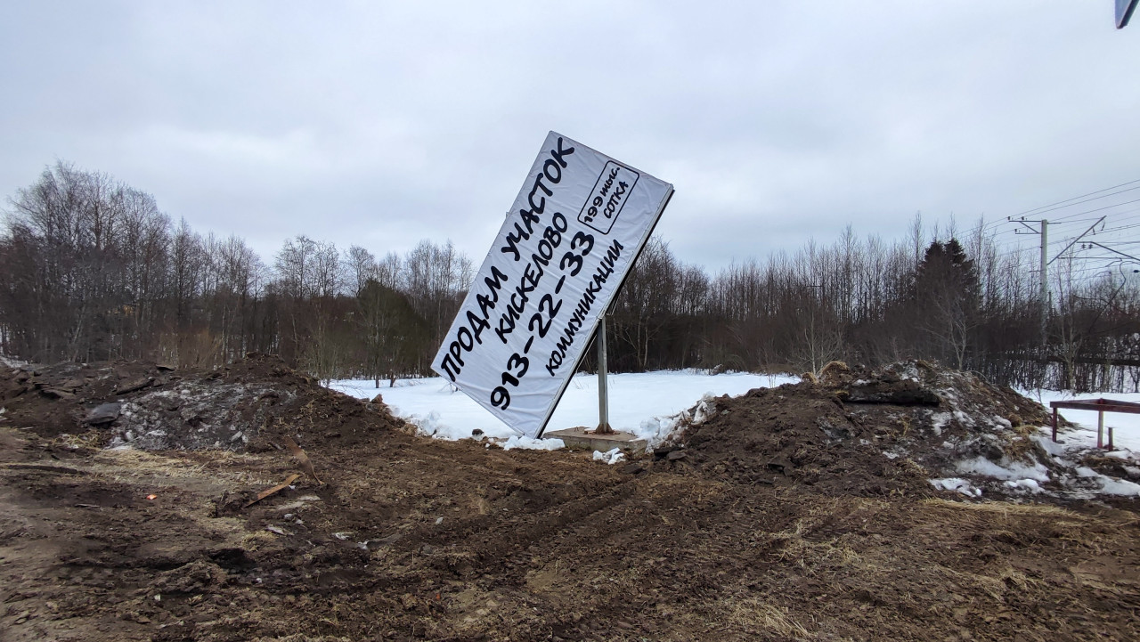 На снимке изображён наклонённый рекламный щит с текстом о продаже участка в посёлке Кискелово. Конструкция нарушена, опора частично вырвана из фундамента. На заднем плане — зимний лес, снег и серое небо. На переднем плане заметны следы техники и земляные работы. Фото подходит для использования в публикациях о техническом состоянии наружной рекламы, загородной инфраструктуре и визуальной среде вдоль дорог.
