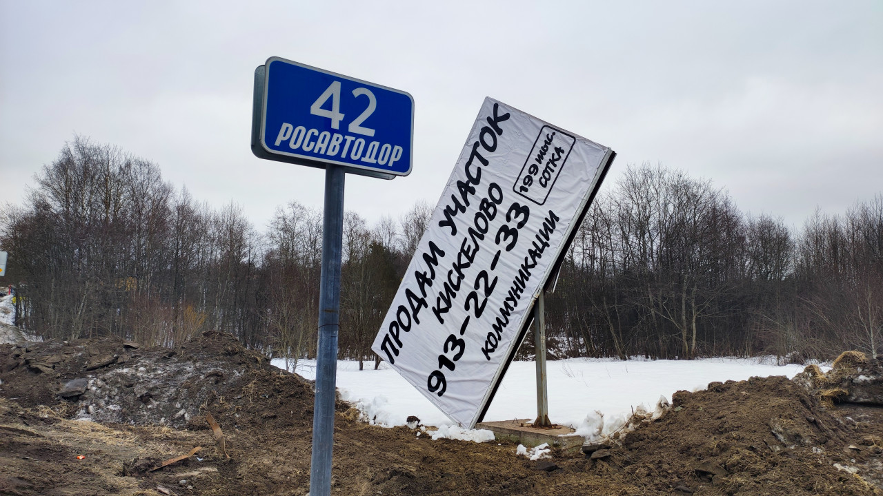 На снимке изображён участок дороги с опорой дорожного знака «42 Росавтодор» и большим рекламным щитом, сообщающим о продаже земельного участка в Кискелово. Щит наклонён, опора частично утоплена в землю. На переднем плане видна промёрзшая почва и остатки снега, на заднем — лесная полоса без листвы. Освещение естественное, пасмурное, что характерно для поздней зимы. Фото можно использовать для материалов о рекламе, дорожных объектах и загородной инфраструктуре России.