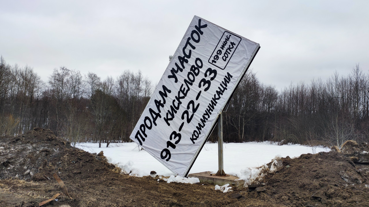 Наклонённый рекламный щит о продаже участка в деревне Кискелово