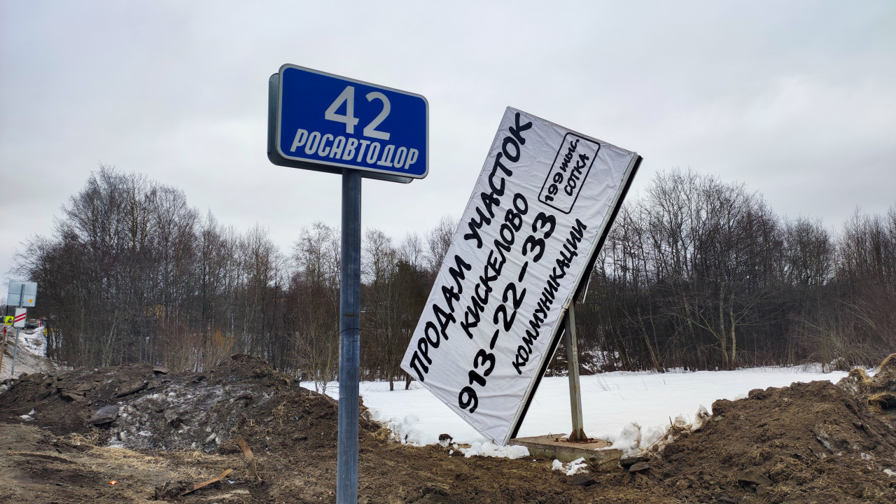 реклама щит билборд наружная реклама баннер Россия Росавтодор дорога трасса Ленинградская область участок продажа земли вывеска зима снег грунт лес поле деревья коммуникации инфраструктура транспорт километровый знак госдорога номер 42 фотография трассы сельская местность реклама недвижимостиПохожие фотографии