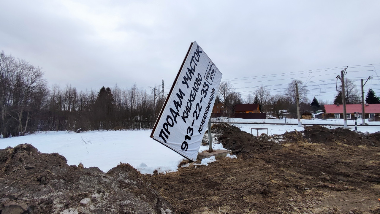 Фотография запечатлела наклонённый баннер с крупным текстом о продаже участка в Кискелово. Конструкция установлена на бетонном основании рядом с грунтовыми насыпями и заснеженным полем. На заднем плане видны линии электропередачи и дома с красными крышами, указывающие на сельскую местность. Освещение естественное, пасмурное, без ярких теней. Изображение подходит для публикаций о недвижимости, инфраструктуре и уличной рекламе в регионах России.
