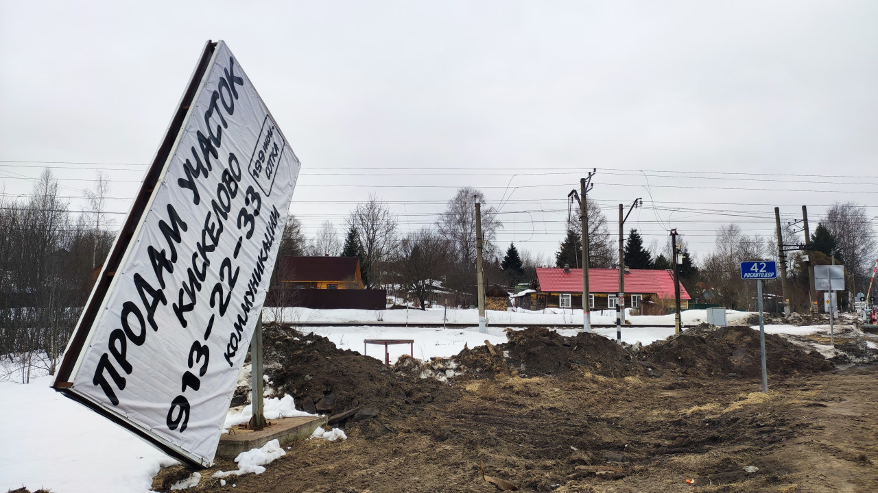 На фото изображён наклонённый рекламный баннер с предложением продажи участка в деревне Кискелово, установленный у дороги рядом с табличкой «42 Росавтодор». За дорогой проходят железнодорожные пути, видны деревянные дома с красными крышами и линии электропередачи. Земля частично покрыта снегом, на переднем плане — грунт и следы строительных работ. Снимок подходит для публикаций о транспортной инфраструктуре, пригородных посёлках и уличной рекламе.