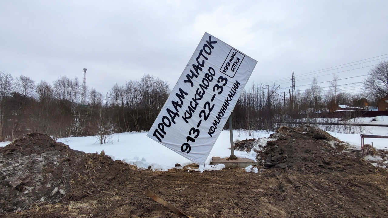Фотография изображает большой рекламный баннер, установленный у дороги и частично наклонённый. На нём указано объявление о продаже участка в Кискелово. На заднем плане — заснеженные поля, лесополоса и линии электропередачи. Земля у основания баннера не покрыта снегом, видны следы строительных работ. Пасмурная зимняя погода создаёт нейтральное освещение. Изображение можно использовать для статей о транспортной инфраструктуре и рекламе.