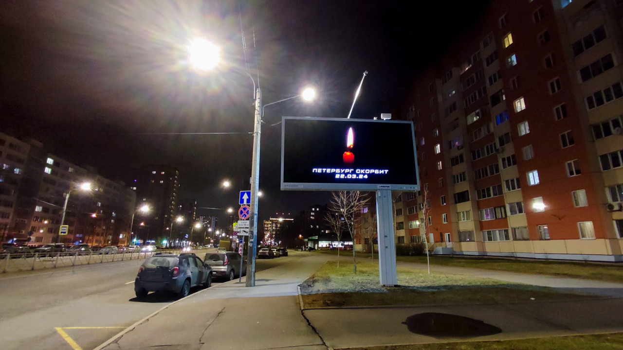На снимке изображён ночной городской пейзаж с большим электронным экраном, на котором показано изображение зажжённой свечи и надпись «Петербург скорбит 22.03.24». Сцена снята на улице среди жилых домов и припаркованных автомобилей, под уличными фонарями. Освещение подчёркивает атмосферу скорби и памяти. Фотография может быть использована в новостных публикациях и документальных проектах о городских событиях Санкт-Петербурга.