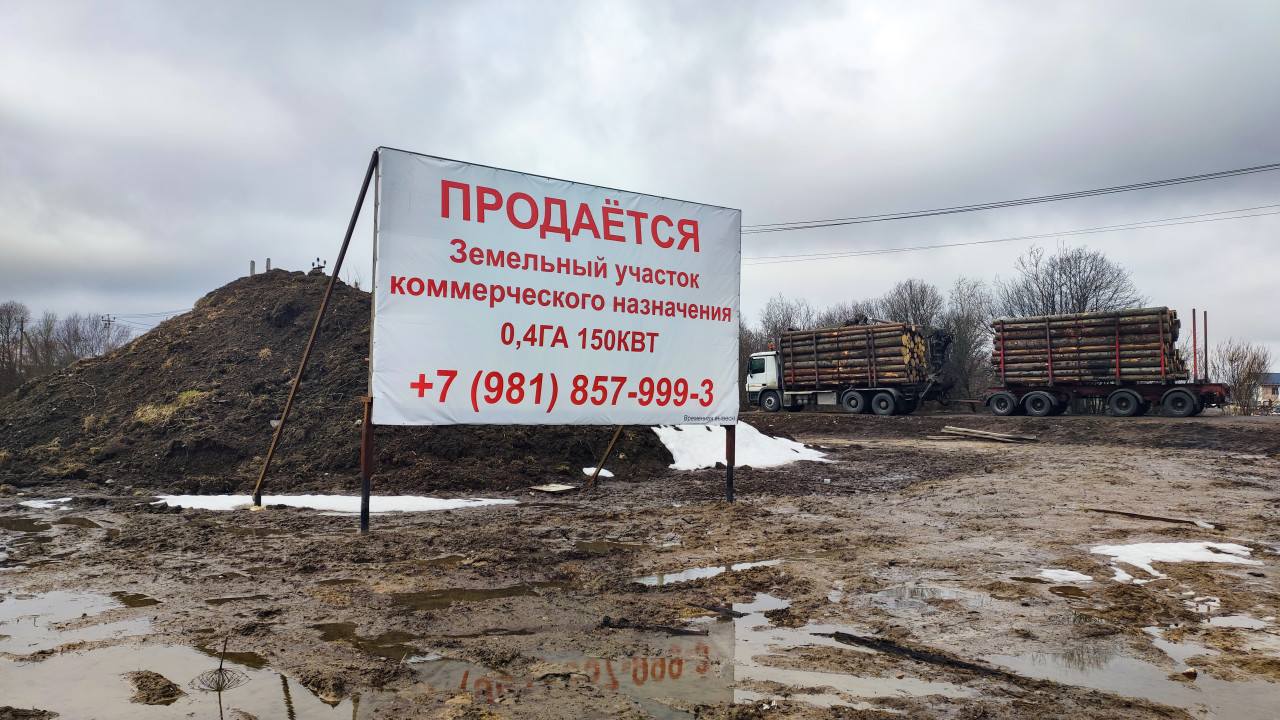 На фотографии показан земельный участок, выставленный на продажу, с большим рекламным щитом. Поверхность участка не заасфальтирована, покрыта лужами и снегом. На заднем плане виден лес и линии электропередачи. Табличка сообщает о параметрах участка — 0,4 га и подключении 150 кВт. Пасмурное небо создаёт индустриальную атмосферу. Снимок подходит для использования в новостях и статьях о коммерческой недвижимости и развитии территорий.