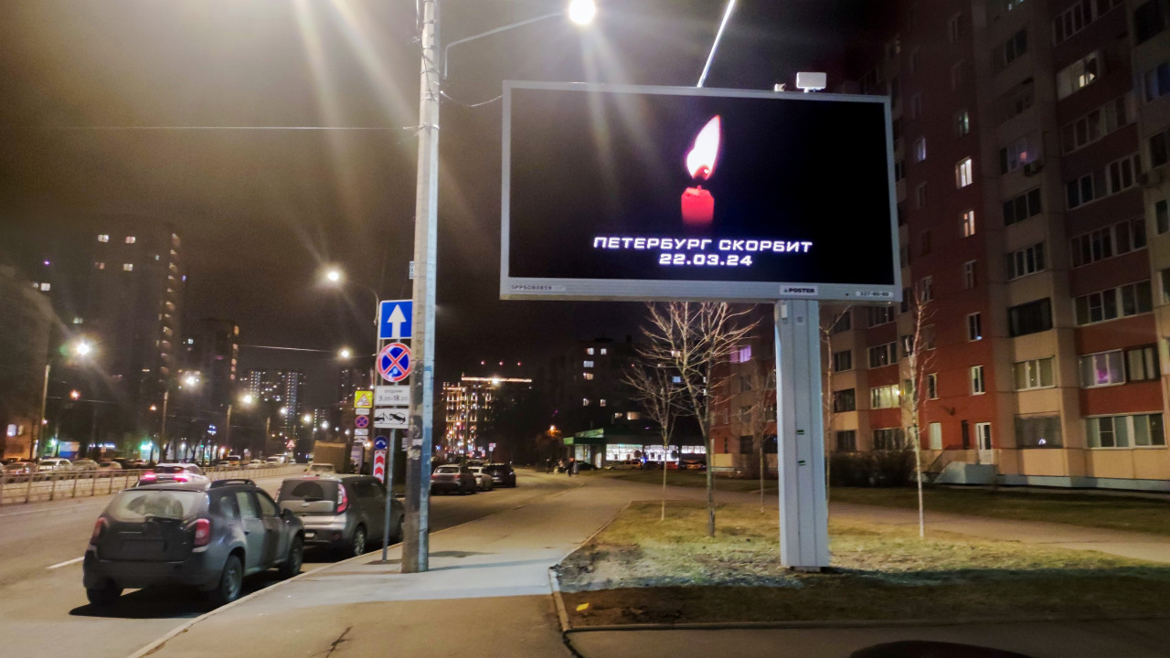 реклама щит билборд наружная реклама баннер Санкт Петербург город улица электронное табло свеча память скорбь ночь фонари освещение автомобили жильё архитектура событие репортаж Россия документальная фотография городская среда траур дата общественное пространство свет здание ночь в городе транспорт урбанистикаПохожие фотографии