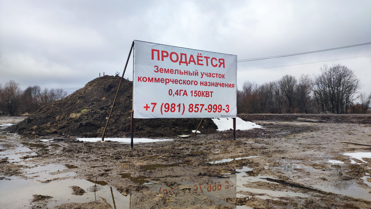 На снимке запечатлён участок земли с рекламным щитом о продаже, на фоне которого проезжает длинномерный грузовик с лесом. Грязная поверхность участка с лужами и остатками снега указывает на весенний период. Позади видна насыпь земли и деревья. На щите указаны параметры участка: 0,4 га и 150 кВт подключённой мощности. Фотография может использоваться в материалах о транспортной инфраструктуре, логистике и коммерческой недвижимости.