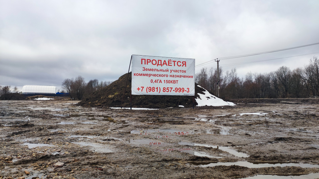 На фото изображён земельный участок с насыпью грунта и большим баннером, сообщающим о продаже земли коммерческого назначения. Щит установлен на фоне лесополосы и промзоны. На земле видны следы техники, лужи и остатки снега. Справа проходят линии электропередач, обеспечивающие доступ к энергии 150 кВт. Фотография может быть использована для публикаций о коммерческой застройке, инвестициях или инфраструктурных проектах.