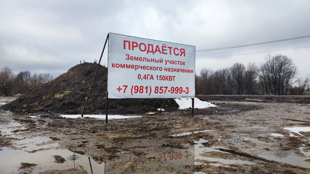 Фотография демонстрирует рекламный баннер, установленный у насыпи земли и линии электропередачи. На табличке указано, что продаётся коммерческий участок площадью 0,4 га с подключением 150 кВт. Поверхность участка неровная и влажная, вокруг видны остатки снега и строительные следы. Ландшафт окружён деревьями и напоминает окраину промышленной зоны. Снимок можно использовать для иллюстрации рынка коммерческой недвижимости и загородных промышленных площадей.