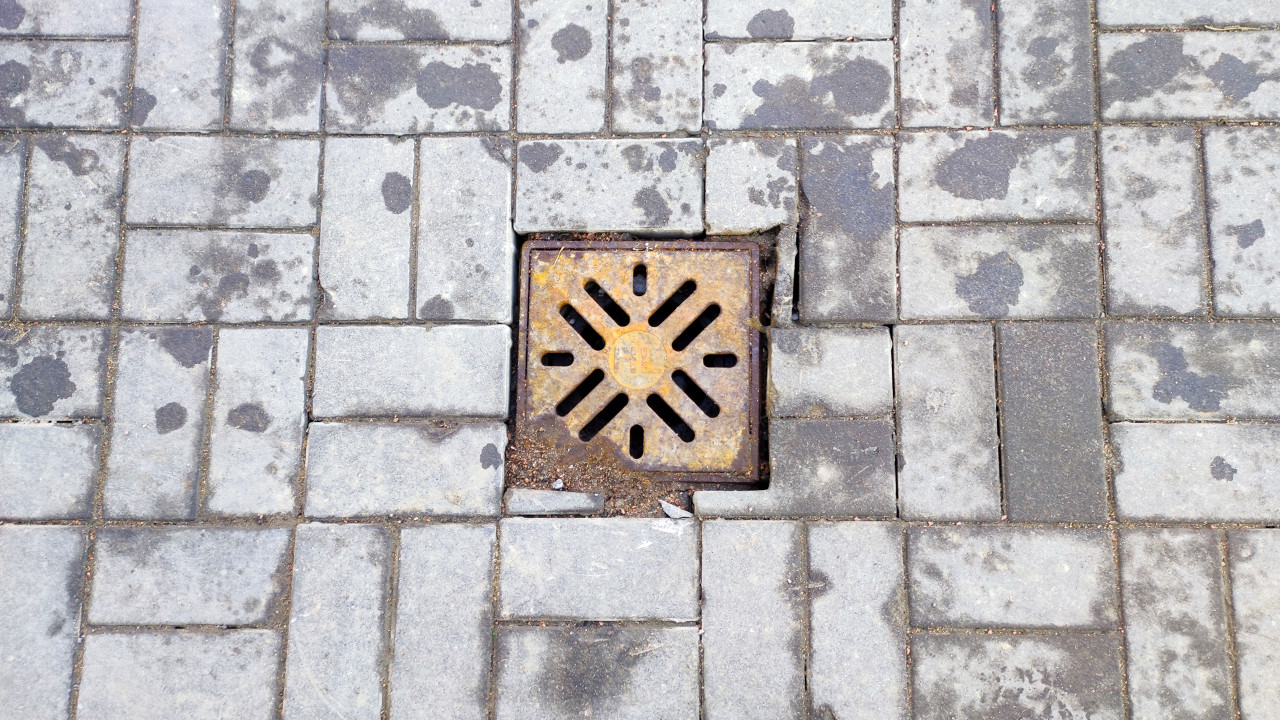 Крупный план показывает металлический квадратный ливнеприёмник, установленный в покрытие из бетонной тротуарной плитки. По периметру заметны следы износа покрытия и характерные загрязнения после осадков. Конструкция относится к уличным инженерным элементам и используется для отвода поверхностных вод. Фотография подходит для учебных и технических материалов по дождевой канализации, проектированию наружных сетей и городскому благоустройству.