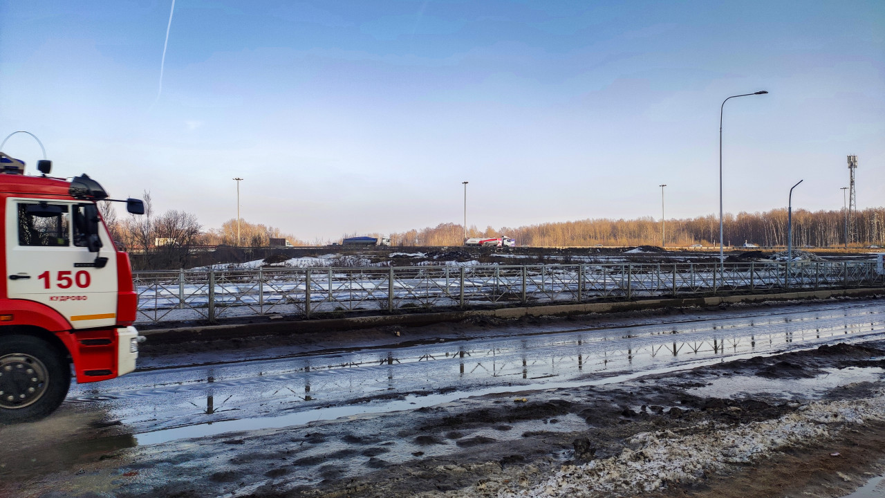 На снимке показан пожарный автомобиль, движущийся по дороге рядом с территорией строительных или ремонтных работ. На заднем плане видны насыпи грунта, ограждения и открытое пространство с редкой растительностью, характерное для окраинной городской зоны. По состоянию снега и освещению можно определить зимний или ранневесенний период. Объект использователен для материалов о работе аварийно-спасательных служб, транспортной инфраструктуре или городских службах.