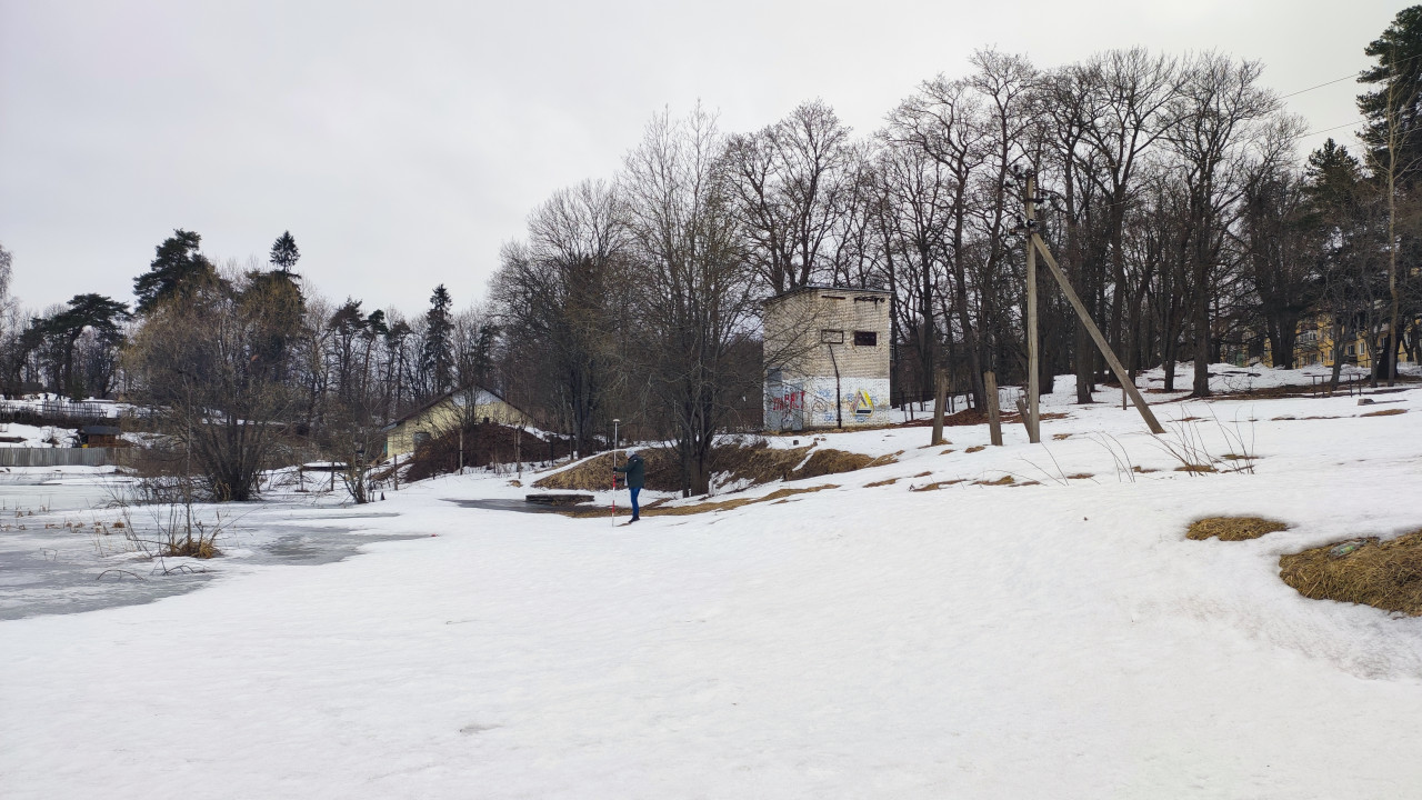 На фотографии изображён человек с геодезическим оборудованием, стоящий на заснеженном берегу замерзшего пруда. На заднем плане находится небольшое техническое здание из бетона с граффити на стенах, использующееся, вероятно, для нужд местной инфраструктуры. Вокруг видны лиственные деревья, опоры электропередачи и следы проталин. Снимок можно использовать в материалах о геодезических работах, инженерии и городской среде в зимний сезон.
