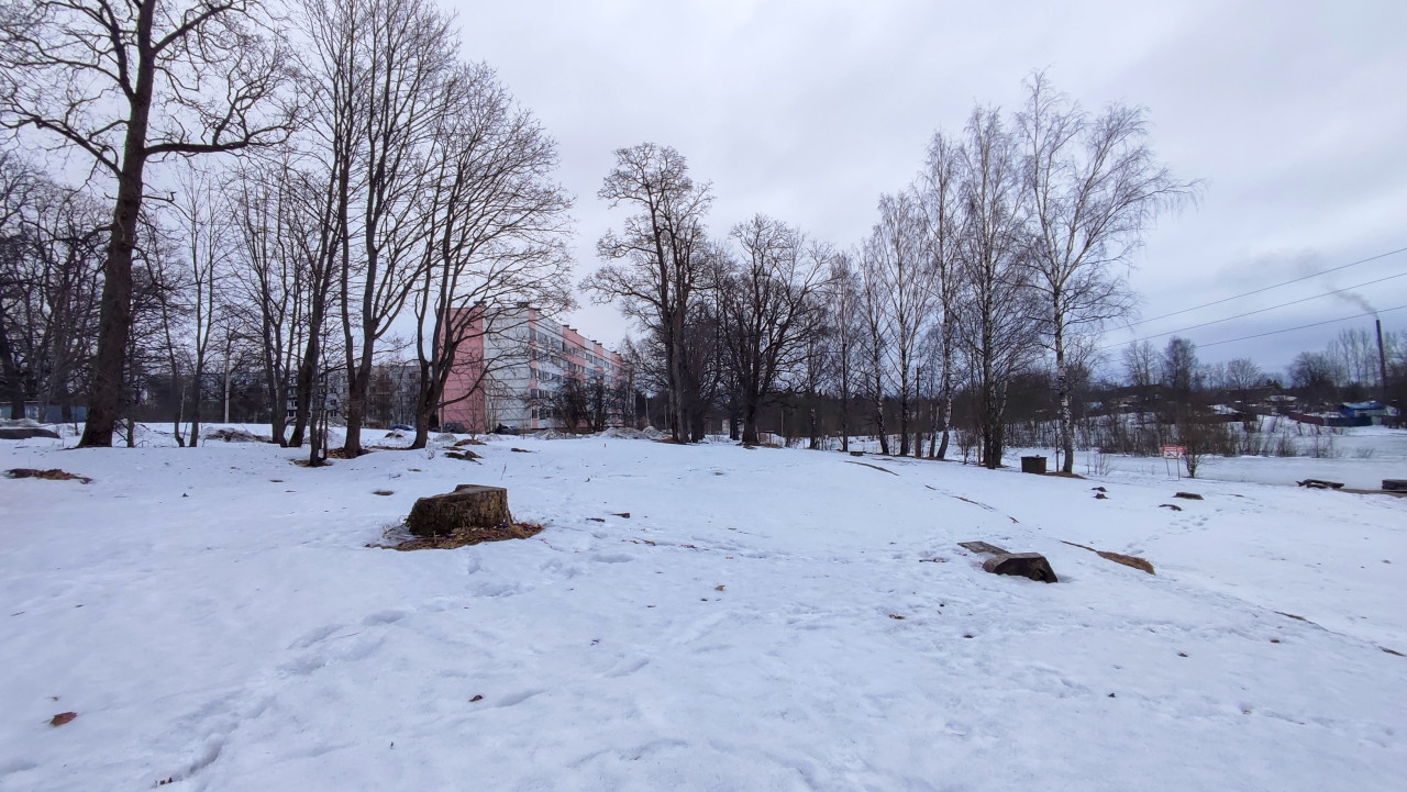 На фотографии изображён зимний городской пейзаж с деревьями без листвы, покрытой снегом землёй и многоэтажным жилым домом розового цвета на заднем плане. Слева видны стволы деревьев, справа — линия электропередачи и заснеженный берег водоёма. На переднем плане заметны пни от спиленных деревьев. Сцена отражает типичный вид российских городских окраин зимой и может использоваться для иллюстрации тем урбанистики, экологии и сезонных изменений.